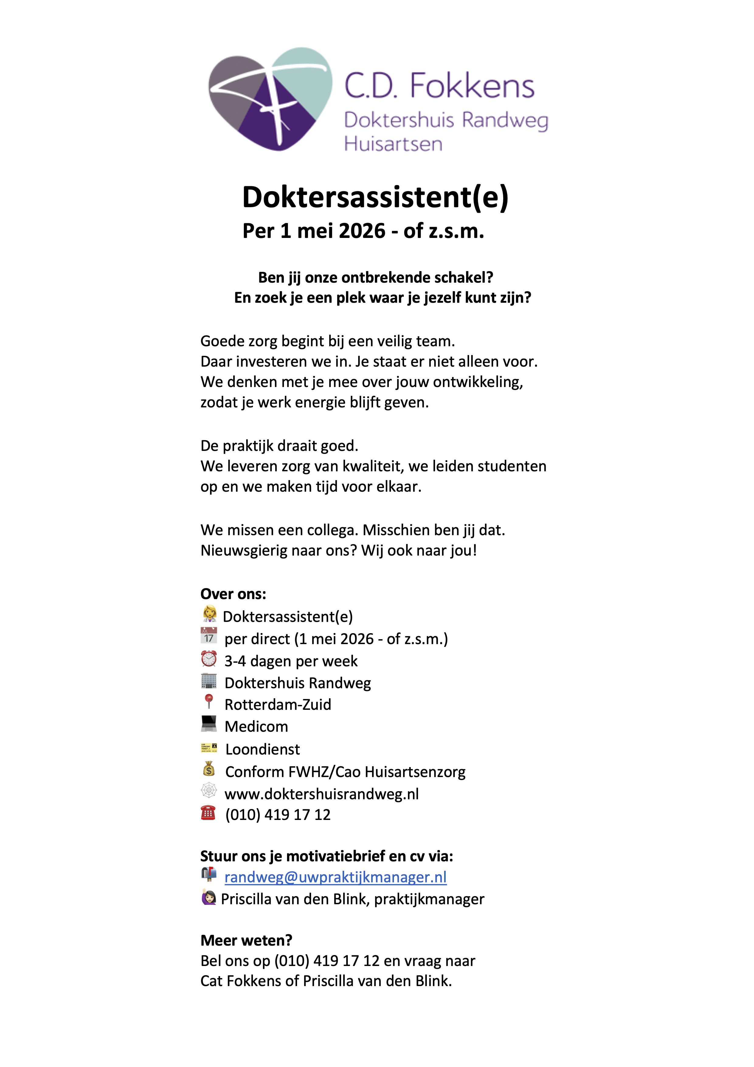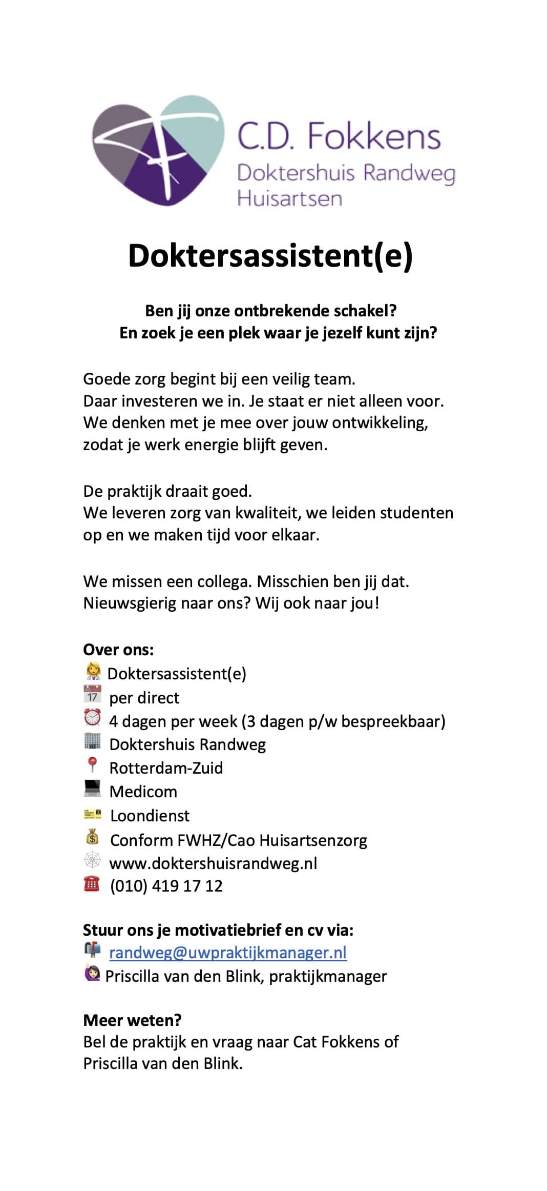 Wij verzoeken u telefonisch contact op te nemen met de assistente indien u een afspraak wenst.